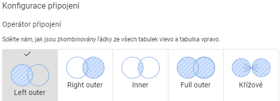 V dnešní době, kdy organizace čerpají data z různých zdrojů a zdrojů dat stále přibývá, je klíčové umět tyto data propojit a analyzovat. Základem pro pochopení principu spojování dat, je vysvětlení jednotlivých typů joinů tzn. způsobu jakým datové zdroje propojujeme. Looker Studio nabízí následující možnosti propojení: